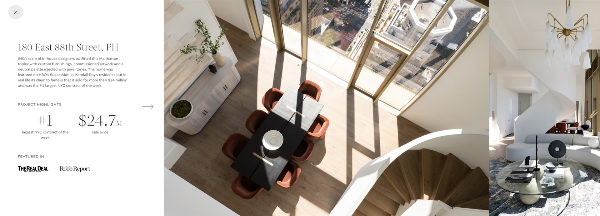 Founded by Cheryl Eisen, IMG is a disruptor in the luxury real estate industry. Combining high-end interior design with an exclusive inventory of furnishings, a dedicated team of designers, fabricators and installers, and a powerful PR and marketing arm, they’ve reinvented how real estate listings are staged and sold.